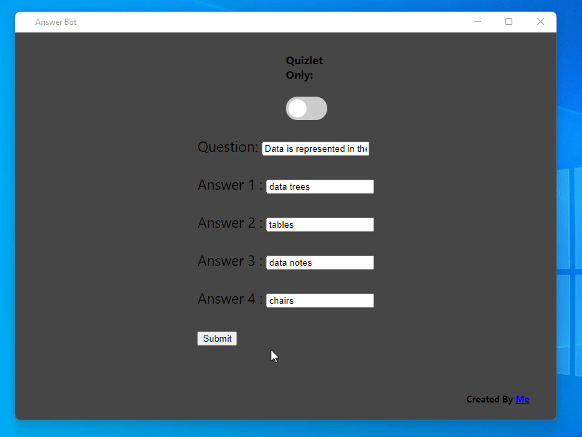 Searches a question and cross references provided answers to look for occurences