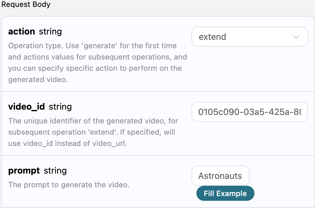 If you want to continue generating the video, you can set the parameter action to extend, and input the ID or video link of the video you want to continue generating. The video ID and video link can be obtained based on the basic usage, as shown in the image below: