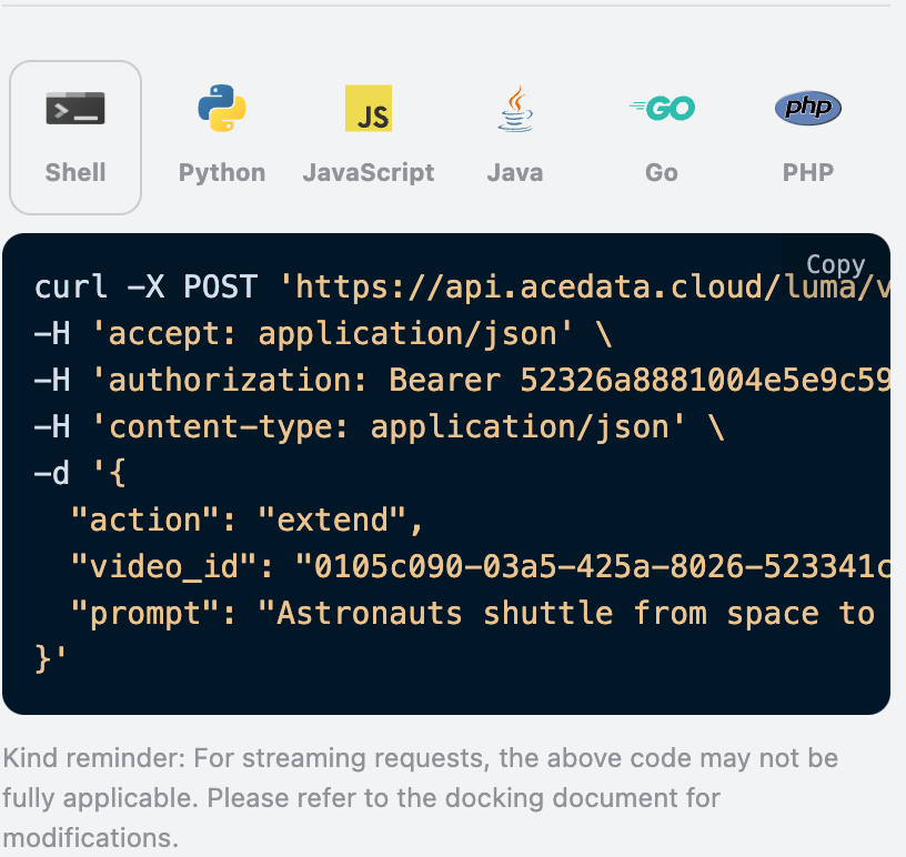 However, Luma does not officially provide an API. AceDataCloud offers a set of Luma APIs that simulate the integration with Suno's official API, making it convenient and quick to generate the desired videos.