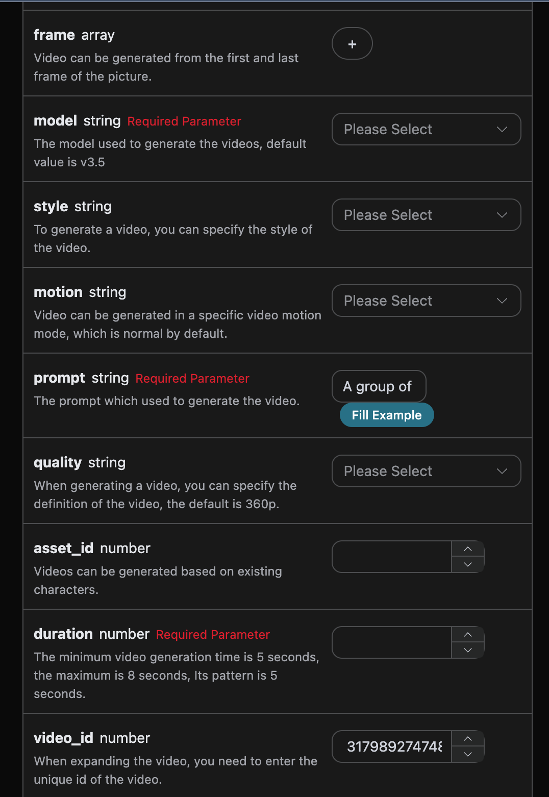 - model: The model used for this video generation task.