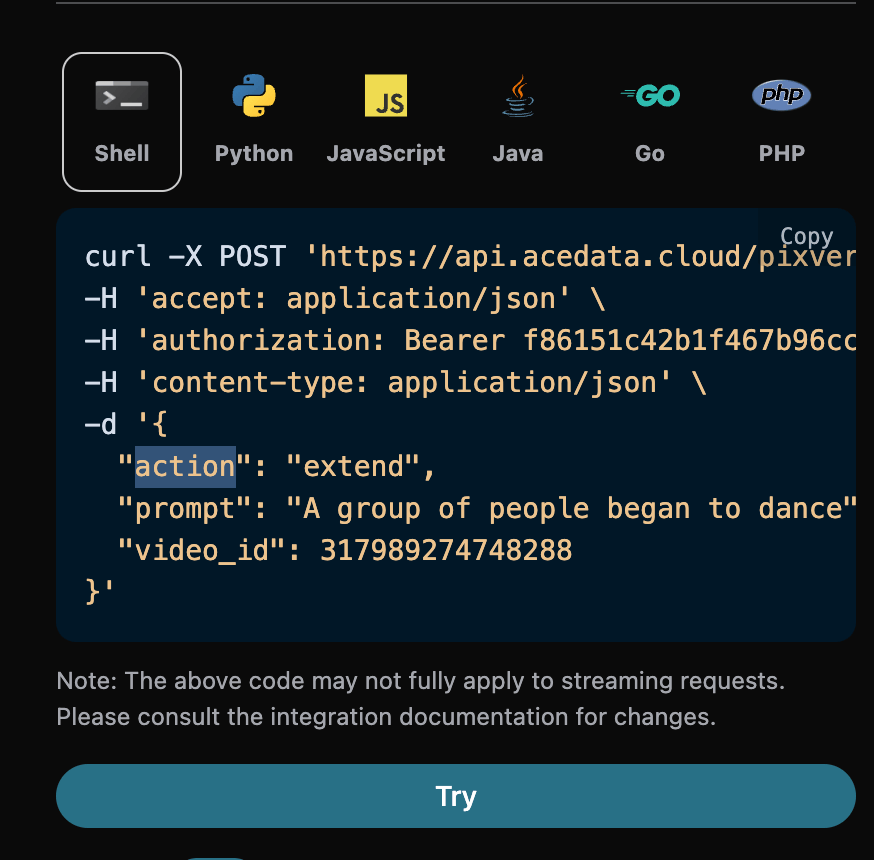 You can click the "Try" button to directly test the API, wait for 1-2 minutes, and the result is as follows: