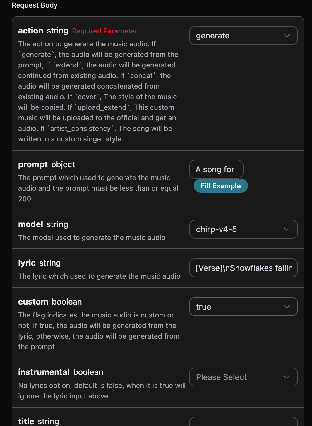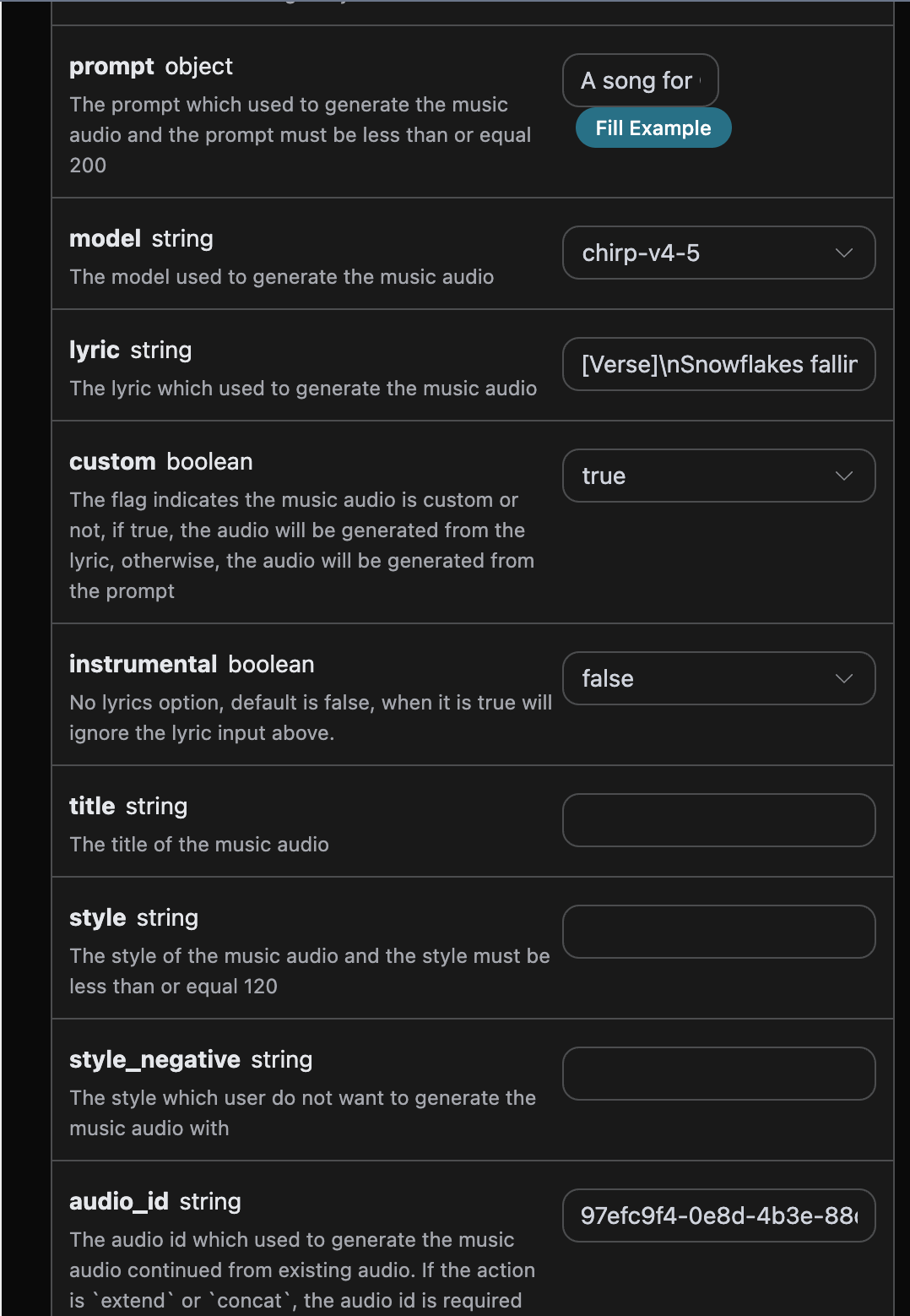 action: the action of this music generation task, default isgenerate, mainly includes:extend,upload_extend,cover,upload_cover,replace_section,concat,stems,all_stems,remaster.prompt: the prompt for the inspiration mode from Suno.model: the model for this music generation task, default ischirp-v3-5, mainly includes:chirp-v3,chirp-v4,chirp-v3-5,chirp-v4-5,chirp-v4-5-plus,chirp-v5.lyric: the lyrics content for the custom mode from Suno.custom: whether to use the custom mode, default is:false.instrumental: the pure music option for the inspiration mode from Suno.title: the music title for the custom mode from Suno.style: the music style for the custom mode from Suno.style_negative: the excluded style for the custom mode from Suno.audio_weight: the proportion of the uploaded reference audio, range 0-1, the larger the more it relies on the reference audio.audio_id: the ID of the reference music.overpainting_start/overpainting_end: the start and end time in seconds for adding vocals to existing pure music.underpainting_start/underpainting_end: the start and end time in seconds for adding accompaniment to a cappella.persona_id: the artist's song ID.continue_at: the time in seconds to continue the existing audio. For example, 213.5 means continue to 3 minutes and 33.5 seconds.style_influence: advanced parameter forstyle_influence.replace_section_end: the final time for the replacement segment.replace_section_start: the starting time for the replacement segment.vocal_gender: control of male and female voices, female voicef, male voicem, effective for models 4.5 and above.weirdness: advanced parameter forweirdness.lyric_prompt: the prompt for generating lyrics, effective only whencustomistrueandlyricis not provided.callback_url: the URL for callback results.