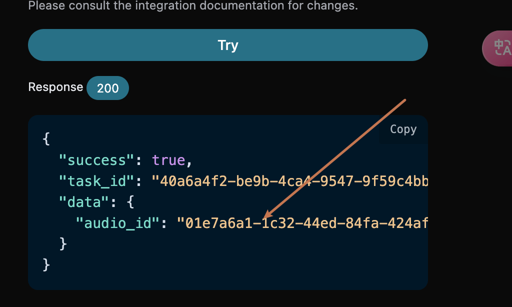 }Using the above audio_id and persona_id as 97efc9f4-0e8d-4b3e-88df-14568fa1b11f and e0d7319e-aa2a-44cb-b00a-916218d7cb0b for this example data. Then you can set the parameter action to artist_consistency (if it is the new version of the singer style Persona-v2-vox, action must be set to artist_consistency_vox), and input the ID of the song to continue generating, and the singer style ID, as shown in the example below: