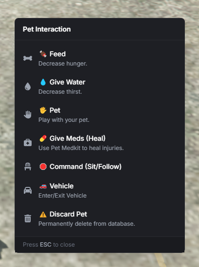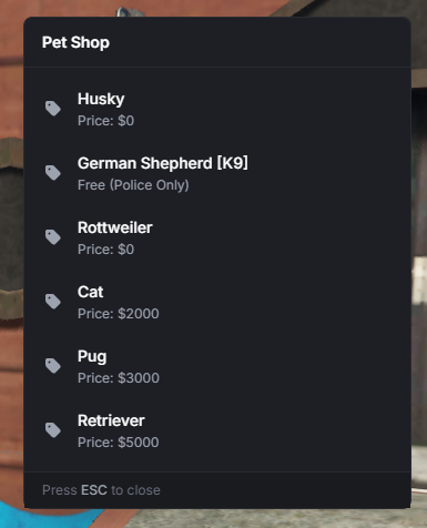An advanced Pet System for FiveM servers. this script allows players to buy, care for (feed/water), and interact with their pets. It also features a fully functional K9 unit system for Police officers (Drug Sniffing & Attacking).