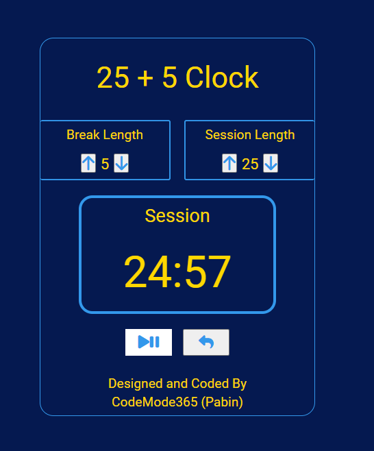 The 25+5 Clock Timer project allows you to set a session time and initiate a countdown. Once the timer reaches zero, it will start a new countdown as indicated by the Break Length. Upon completion of this second countdown, the timer will reset to the beginning of the Session Length and continue to count down. This process will repeat indefinitely, with an alarm sound playing each time the timer reaches zero. The timer is designed to provide a tool for increased focus and productivity, looping infinitely to ensure an ongoing experience.