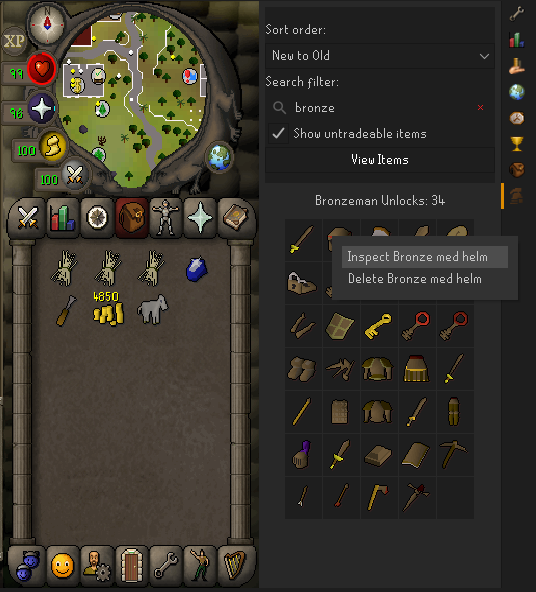You can see all your unlocks in the Another Bronzeman Mode side-panel as a neatly sortable and filterable list of items. This interface comes with search functionality, as well as the ability to re-lock an item by right clicking it and selecting "Remove".