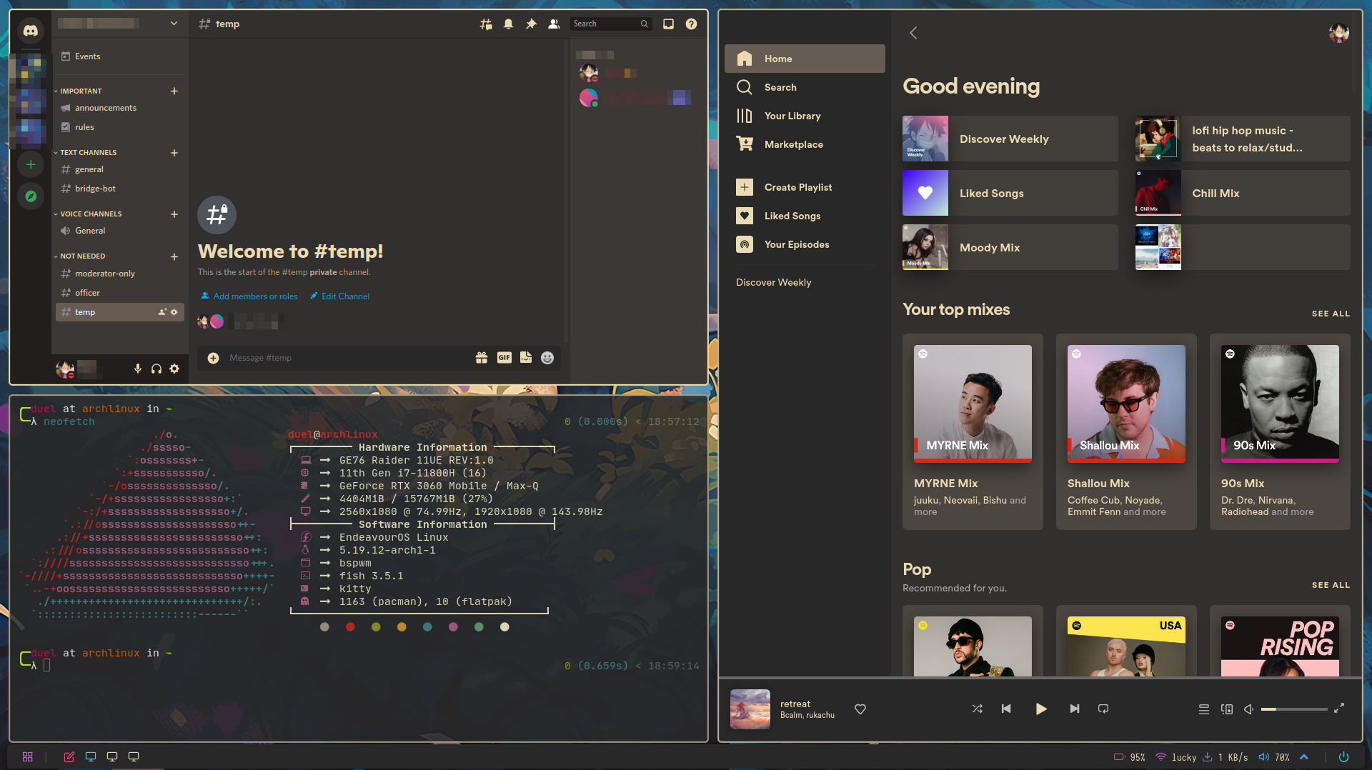 yay -S spicetify-cli btop fish neofetch kitty polybar rofi picom-pijulius-git stalonetray polybar-spotify-module lxappearance-gtk3 nitrogen nautilus xdo spotify discord-canary dunst