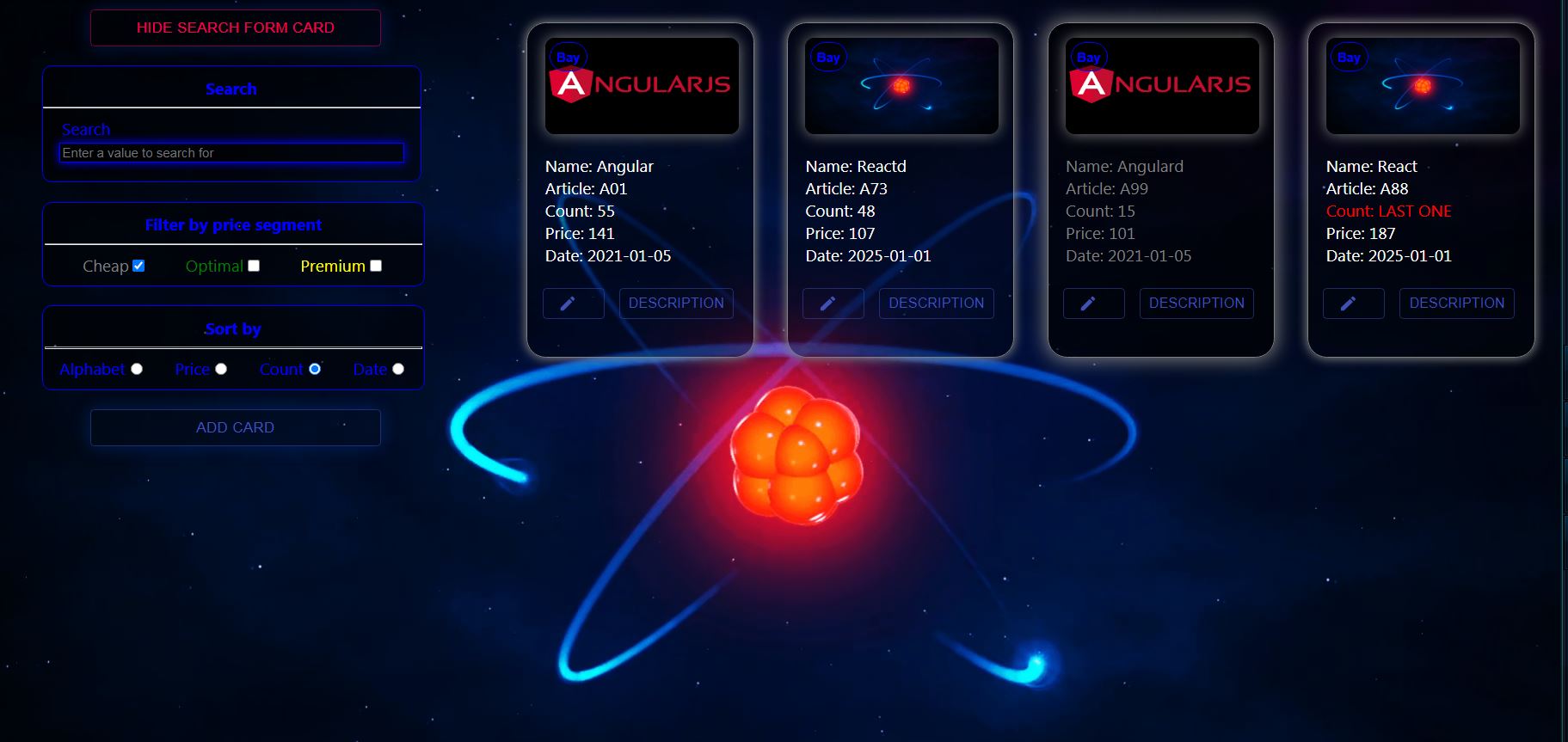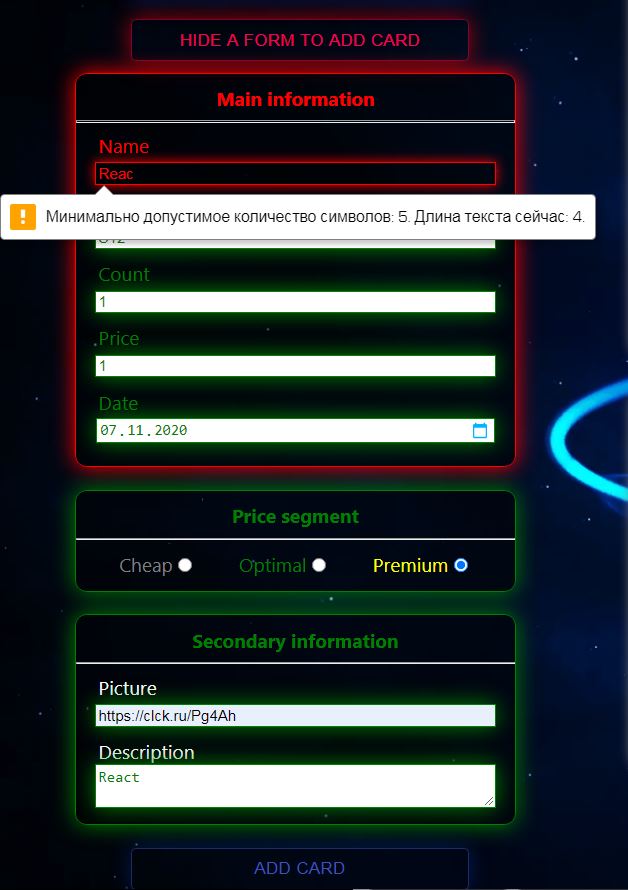 Данные, введенные в поля ввода, проверяются также, как при создании товара и не сохраняются, пока они не введены корректно. После успешного завершения процесса редактирования дата обновления сохраняется автоматически, исходя из реальной текущей даты. Карточку можно удалить из списка в режиме редактирования, нажав кнопку удалить.
