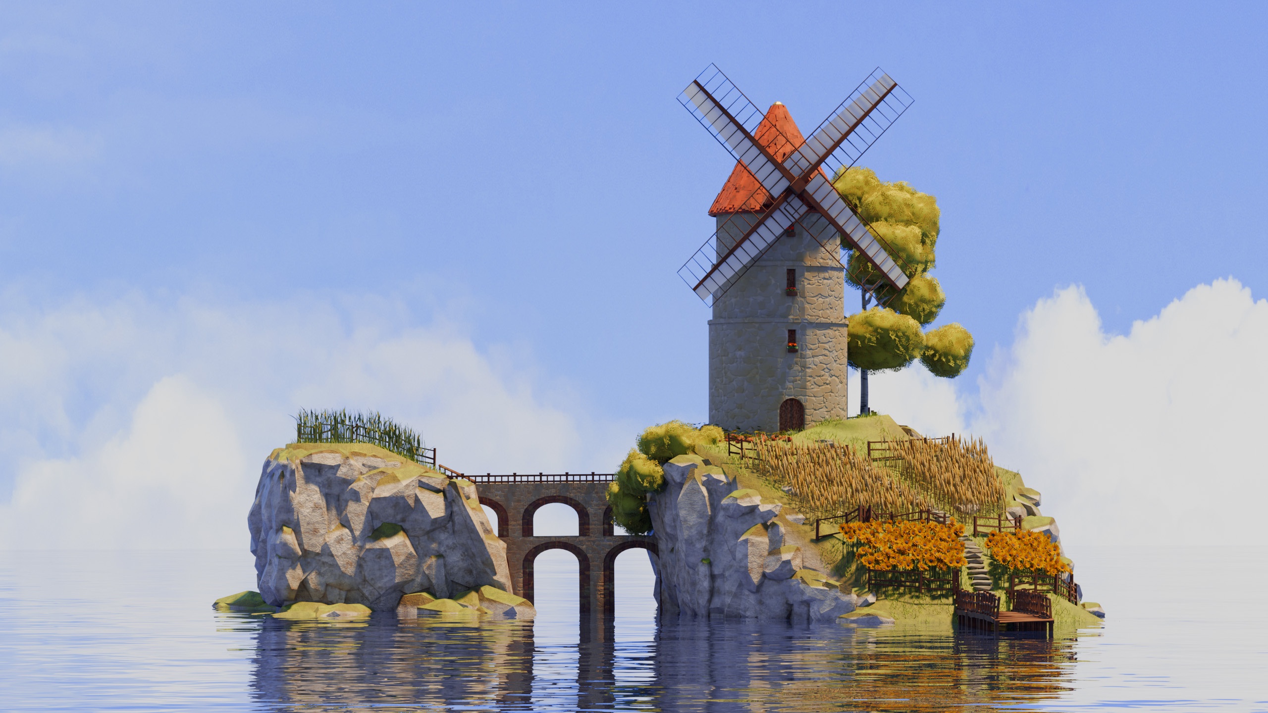 There are also windmills, farm fences, wooden shaky bridges, sun flower, wheat and corn fields and pumpkins.