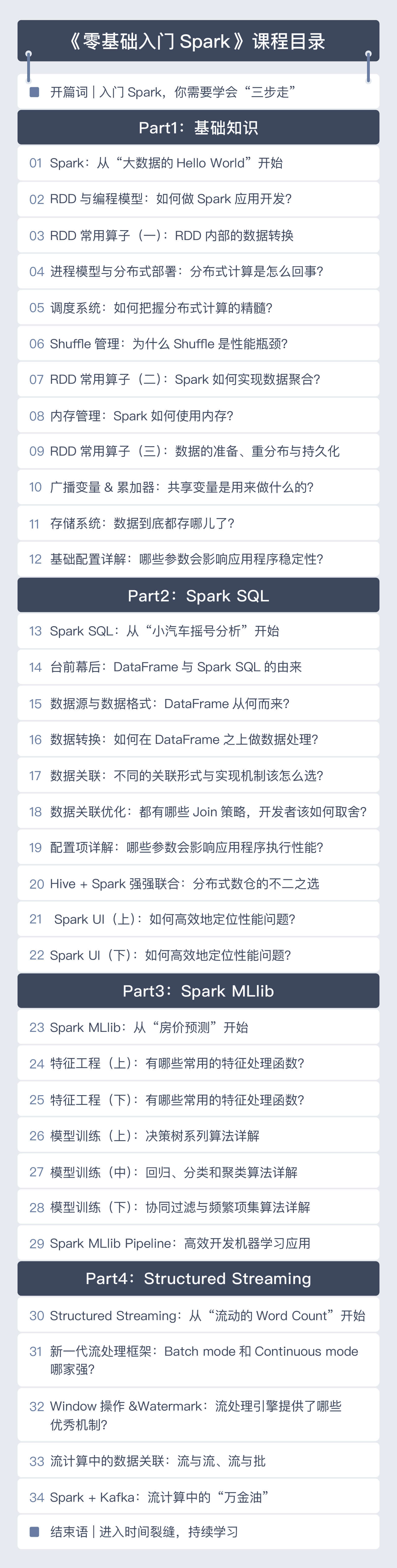 | 31 | +助你零基础上手 Spark 。这“三步走”方法论再配合 4 个不同场景的小项目,吴磊老师会从基本原理到项目落地,深入浅出玩转 Spark。 |