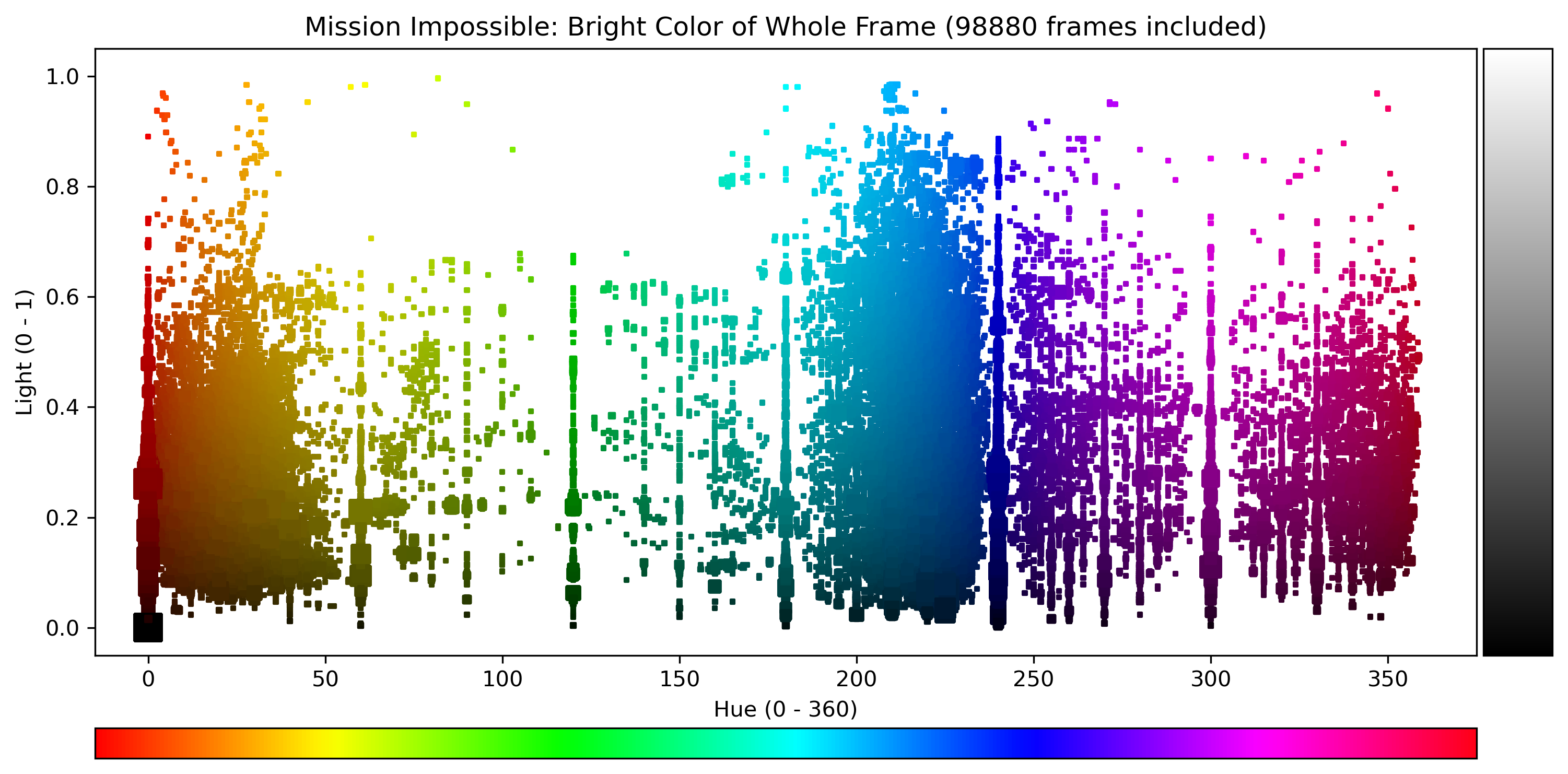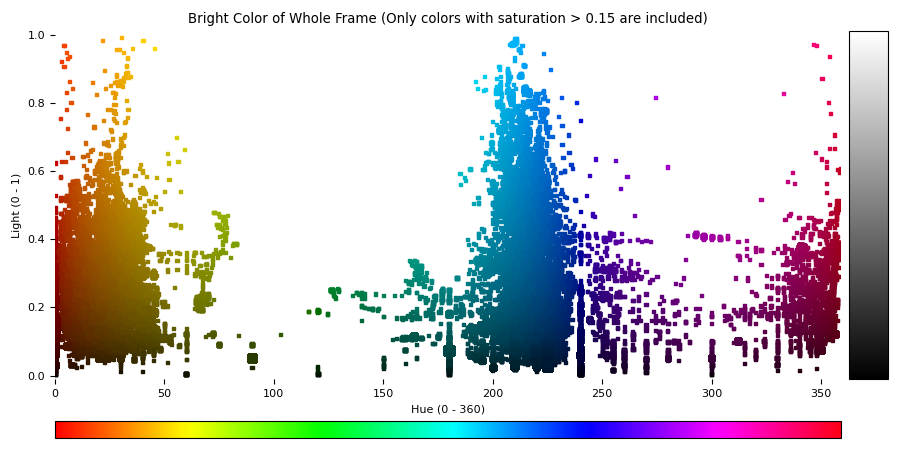 To avoid the artifacts created from the colorless data, we now exclude the colors with saturation lower than 0.15 when creating this scatter plot. This threshold can be customized in the programming API using the parameter saturation_threshold.