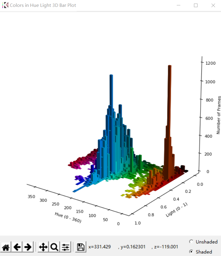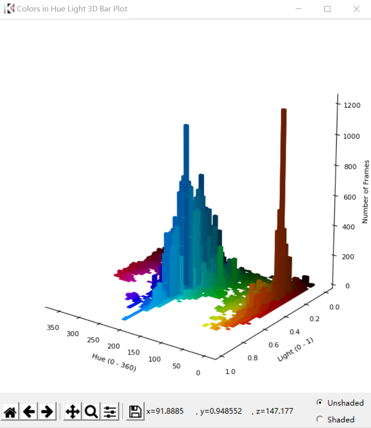 Now, you can rotate the 3D Bar plot in the *Colors in Hue Light 3D Bar Plot window with arrow keys. rotate counter-clockwise, rotate clockwise, from down to up, and from up to down.