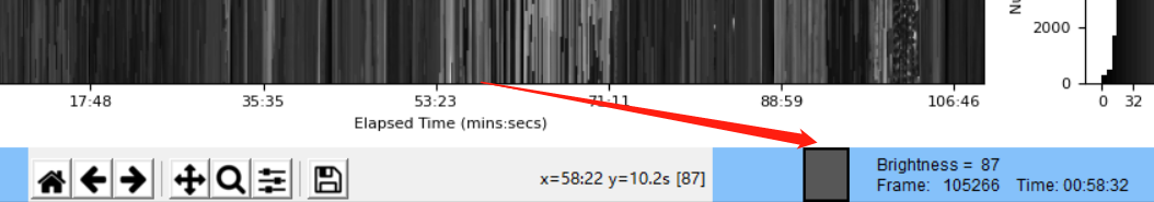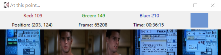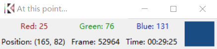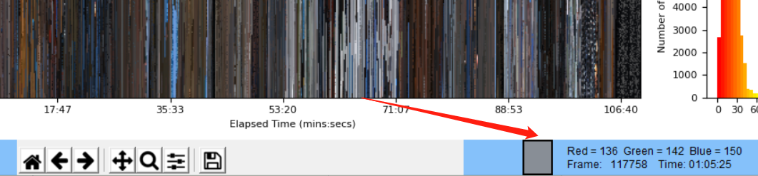 Color swatch. A small color display is now added to the main window under the barcode plots. When the user's mouse hovers over a pixel of the barcode, the color display will show the color of that pixel along with red, blue, green, frame, and time at that pixel.