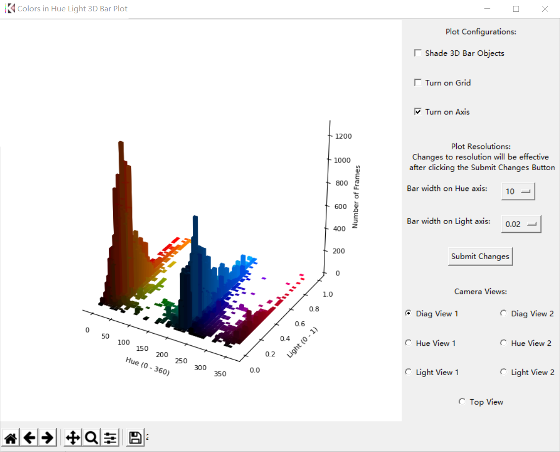 Users may now turn on/off the shade on 3D objects, grids, and axis. The resolution of the plot (in the other words, the dimension of a 3D bar) can also be configured in the plot resolutions section. Smaller bar width on Hue/Light axis will increase the number of 3D bars in the plot (higher resolution), providing more details. Larger width will decrease the number of 3D bars and improve the performance (e.g. the refreshing speed when spinning or zooming the plot). Users can also switch to 7 pre-defined camera positions using the Camera Views.