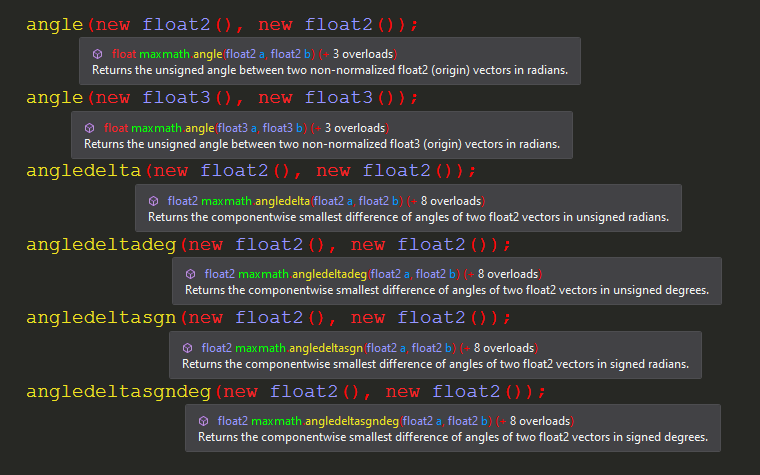 byte32,short16,int8, andfloat8. This allows you to leverage the full potential of SIMD computation. - Many Additional Functions: MaxMath includes a massive library of mathematical functions not found in Unity.Mathematics, with about five times as many highly optimized functions at your disposal. Each function is fully documented with XML annotations. A full list is provided further below.