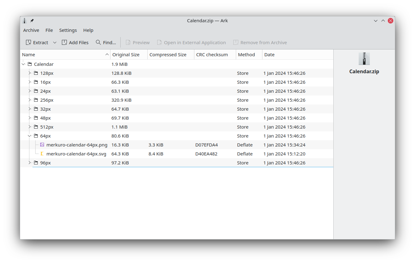 Ark manages various archive formats, including tar, gzip, bzip2, rar and zip, as well as CD-ROM images. Ark can be used to browse, extract, create, and modify archives.