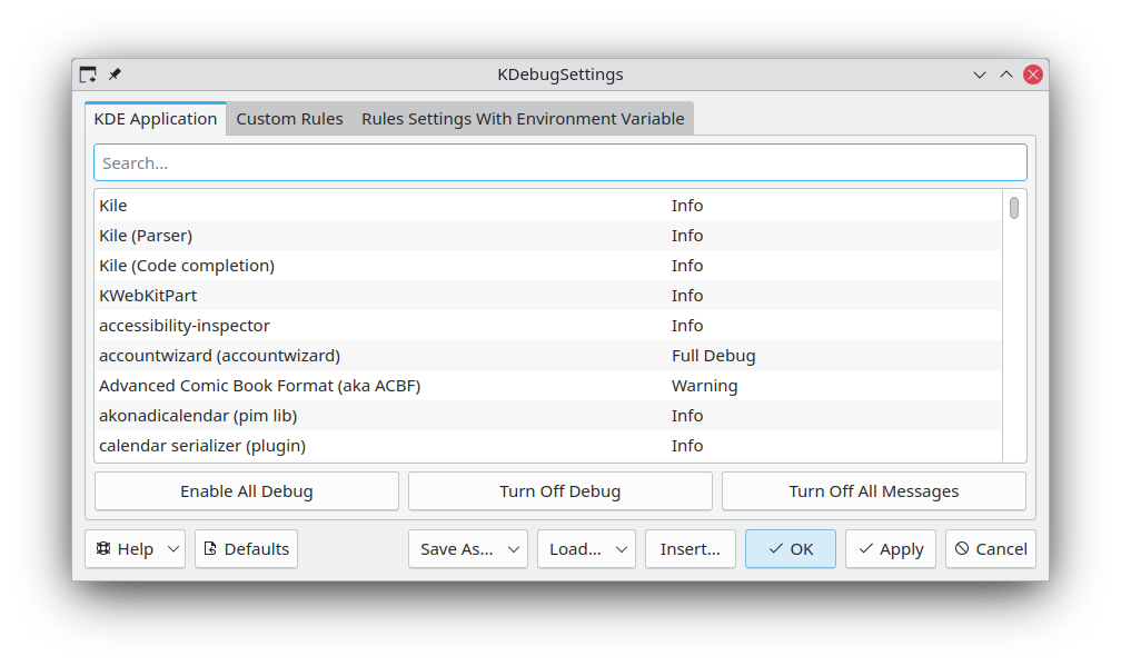KDebugSettings edits which QLoggingCategory are displayed.