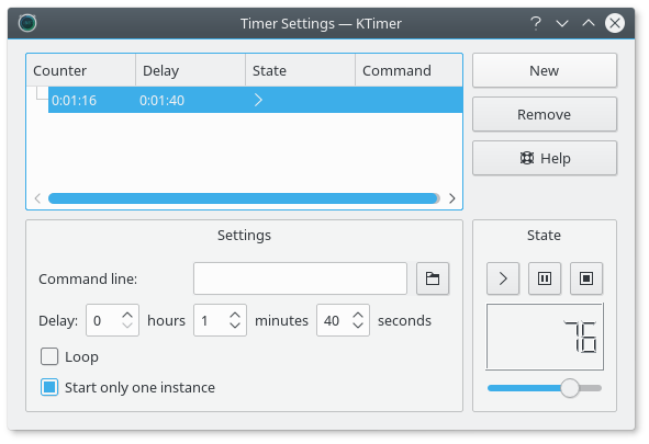 KTimer is a countdown timer for running commands after a delay. The countdown can be paused or set to loop continuously.