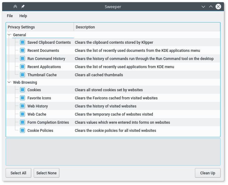 Sweeper can quickly remove temporary information, such as web page cookies, browser history, or the list of recently-opened documents. It helps provide additional privacy on a system shared between multiple users.