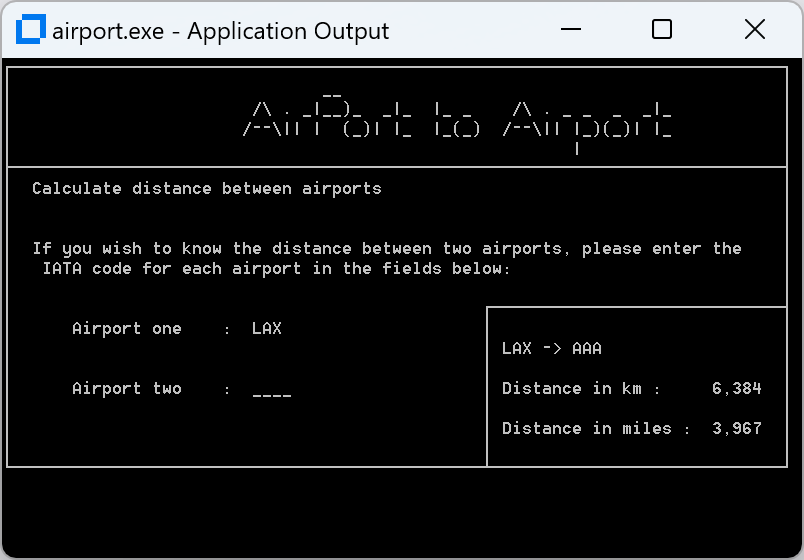 - Follow the instructions on the console. To see the available airport codes view the airports.dat file by opening it using the Data File Editor.