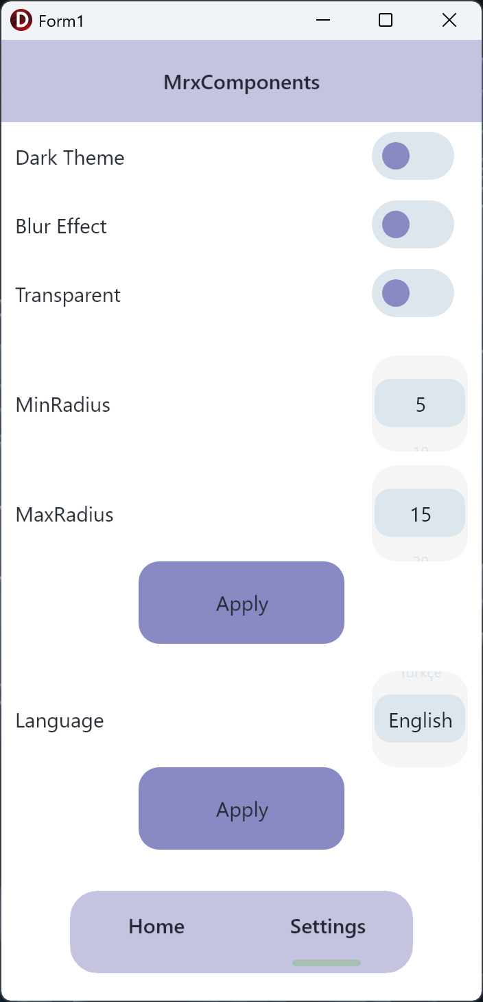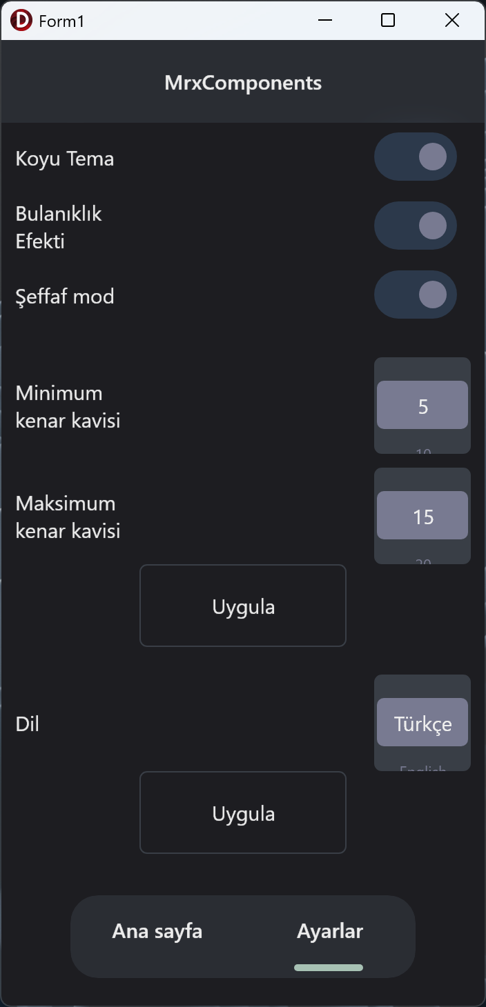 TMrxLanguages.TranslateUI(self);Themes unit’i, MrxComponent ekosistemi içerisinde uygulamanın tema (theme) ve renk paleti yönetimini merkezi hale getirmek amacıyla oluşturulmuş, görsel olmayan (non-visual) bir yapı sunar. Bu unit, farklı tema modları için tanımlanan renk değerlerini tek bir noktada toplayarak, bileşenlerin tutarlı ve ölçeklenebilir şekilde tema desteği kazanmasını sağlar.