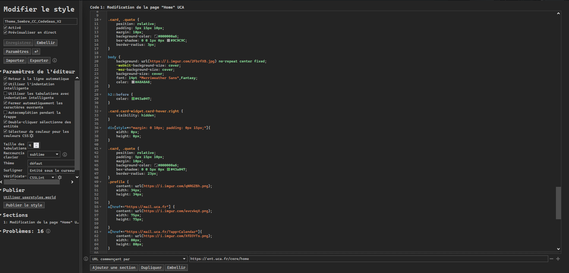 https://ent.uca.fr/cas/login - Enregistrer le tout, vous pouvez maintenant recharger votre page. Vous pourriez constater que le thème a bien été appliqué.