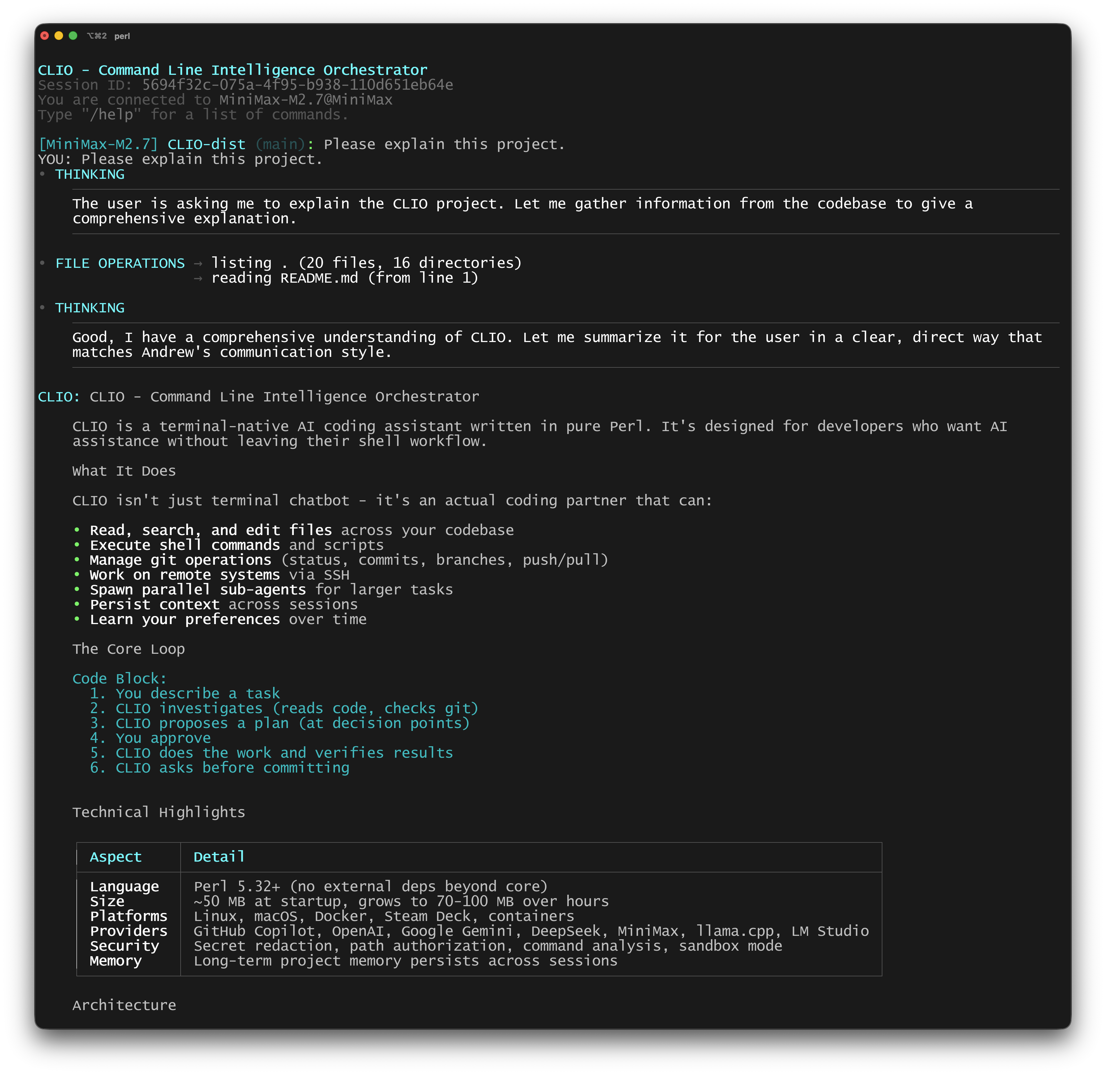 I built CLIO for myself. As someone who prefers working in the terminal, I wanted an AI assistant that felt native to my workflow. One that respected my privacy, worked anywhere Perl runs, and gave me full control over my code and tools. I couldn't find anything that met those needs, so I created CLIO. Like most of my work, I build tools for myself first and release them as open source in the hope that they're useful to other people too.
