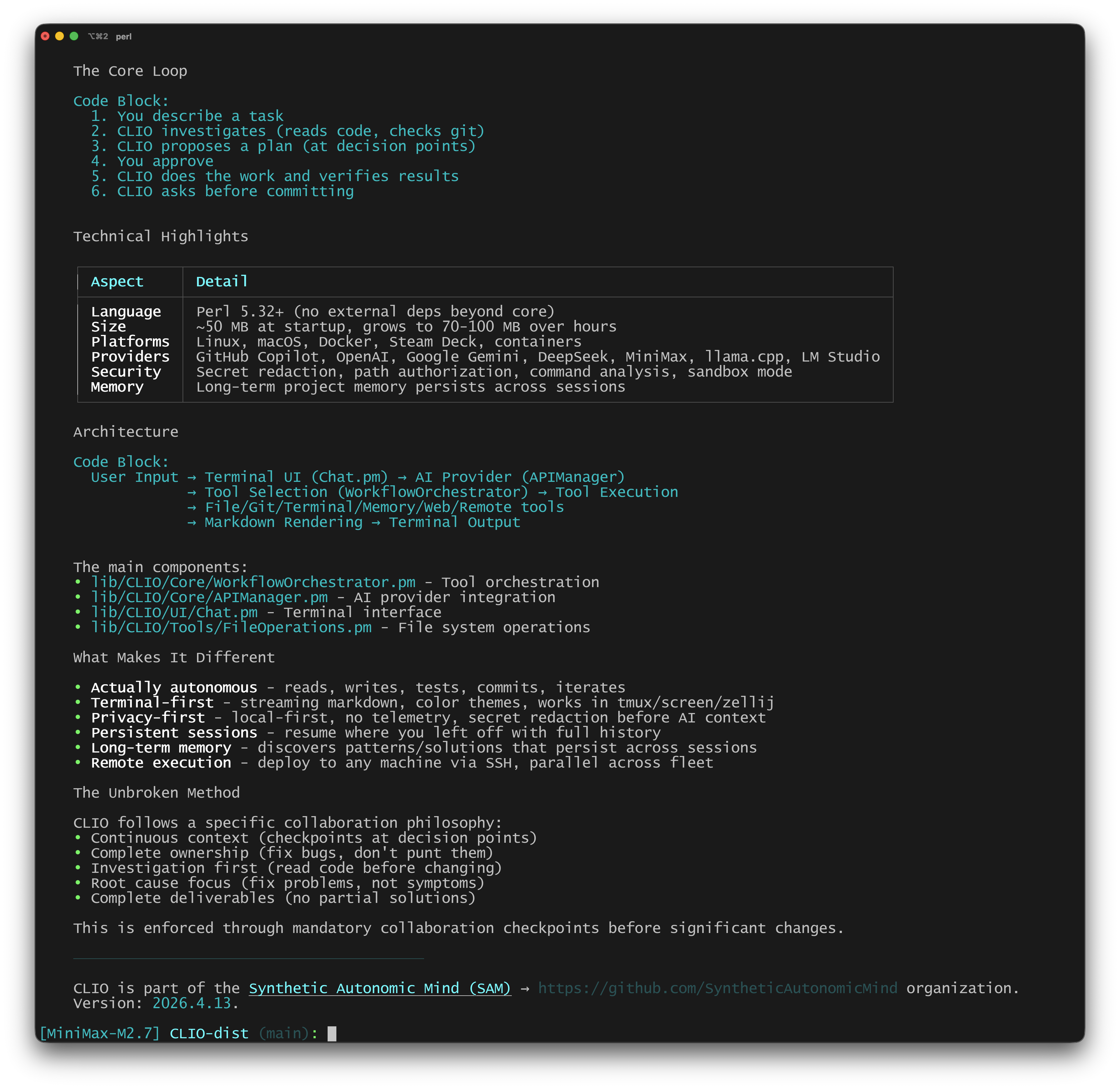 CLIO is part of the Synthetic Autonomic Mind (SAM) organization, which is dedicated to building user-first, privacy-respecting AI tools. If you value transparency, portability, and the power of the command line, CLIO is for you.