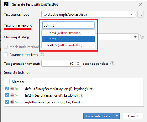 In the Generate Tests with UnitTestBot window choose the necessary Testing framework: JUnit 4, JUnit 5 or TestNG.