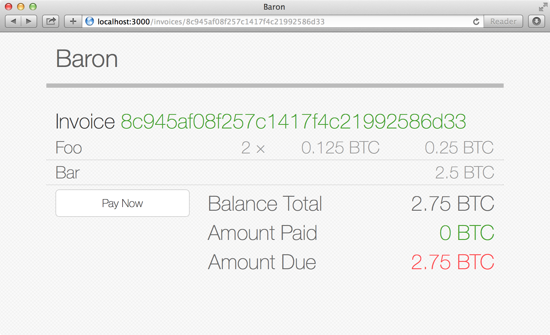 access_token- The API key for Baron to verify that invoice creator is trusted [1]currency- Currency of the invoice, can be either USD or BTCmin_confirmations- Minimum confirmations before a payment is considered paidexpiration(optional) - Expiration time for invoice (unix timestamp)terms- (optional) A URL to a specific terms and conditions page for this invoicewebhooks- (optional) An object containing event webhooks [2]line_items- Array storing line itemsdescription- Line item description textquantity- Quantity of the item purchasedamount- The unit cost of the line item [3]