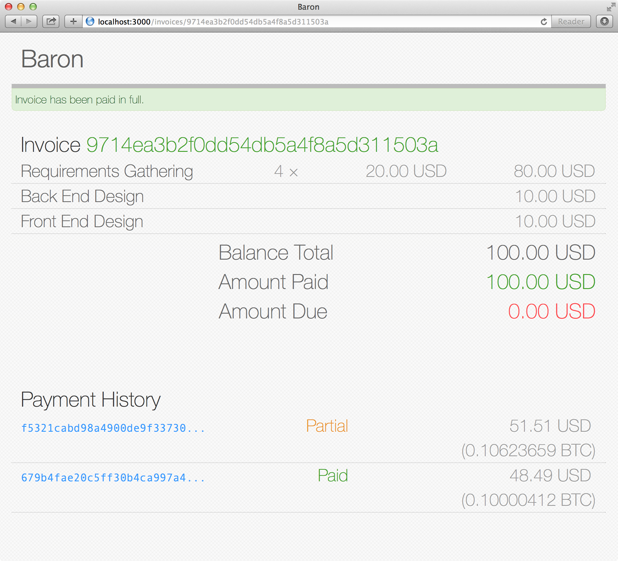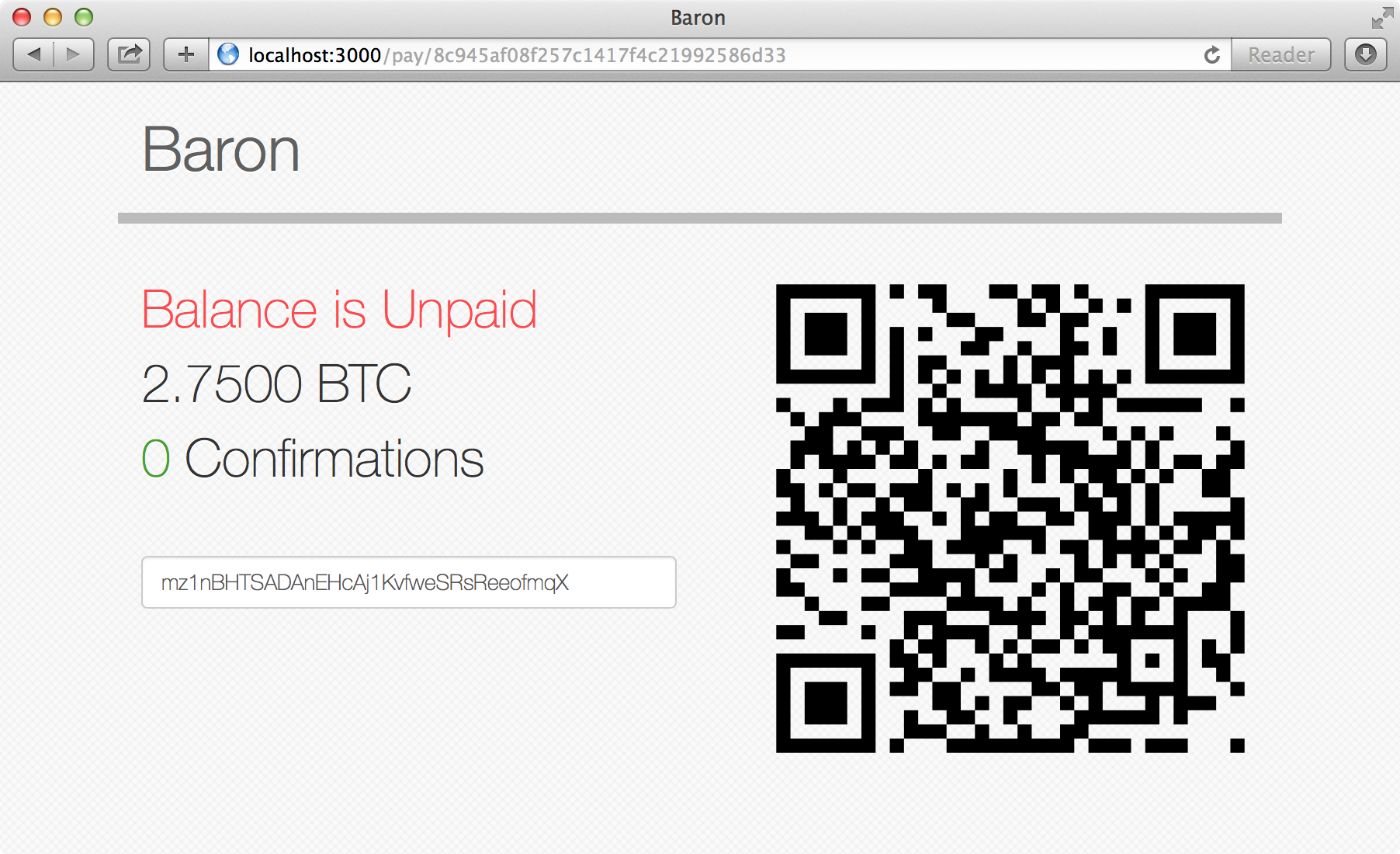 Baron is also able to handle partial payments. When a payment only partially fulfills an invoice the user can click the 'Pay Now' button again, this will create a new payment with the remaining balance. If the user has script enabled the payment page will automatically refresh with an updated remaining balance and payment address. Alternatively user's can also send multiple payments to the same address.