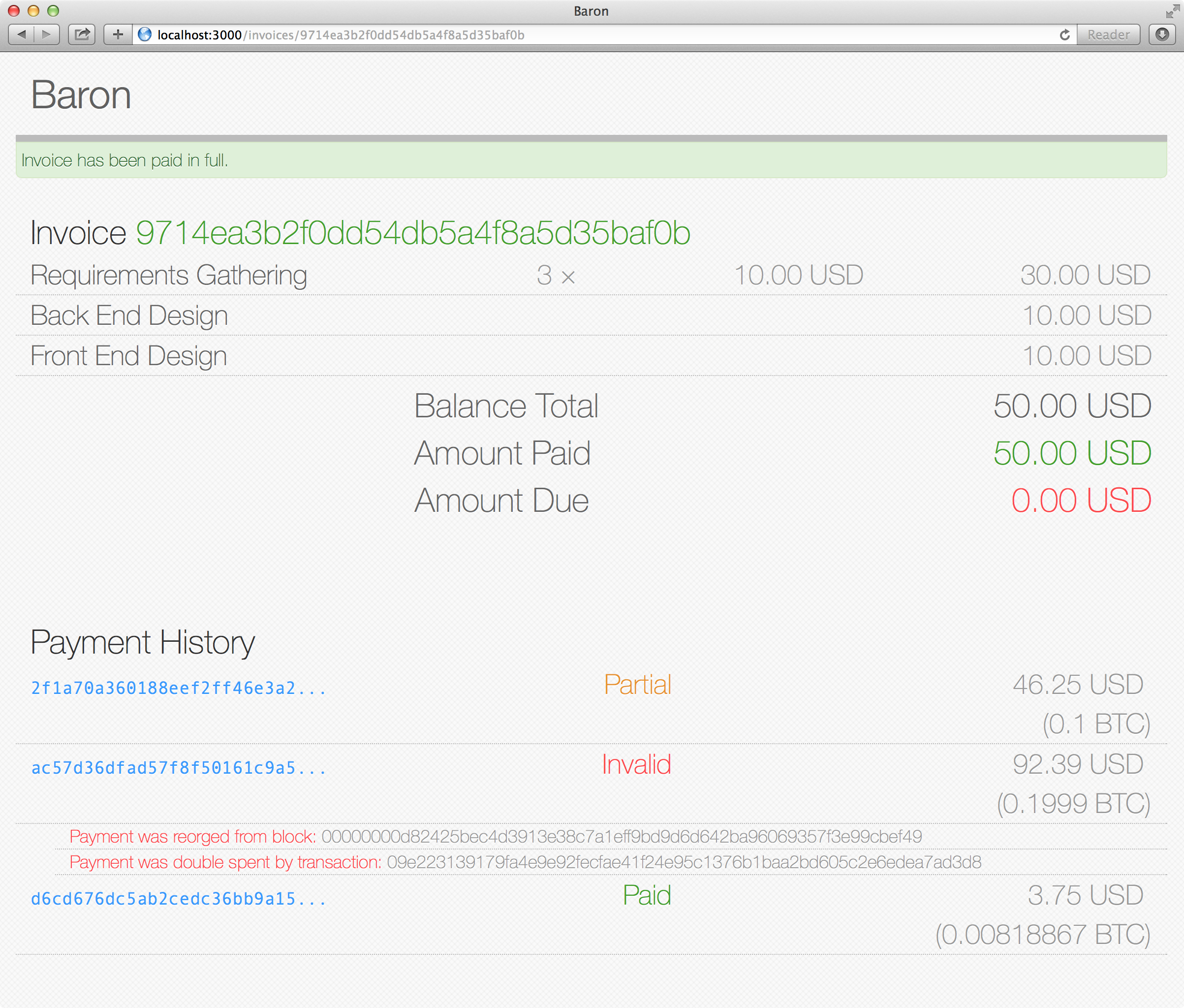 invoice_id- Invoice that this payment is associated withaddress- Address to send BTC toamount_paid- Stores the amount that was paid (Always stored in BTC)expected_amount- Stores the amount that the payment expects to receiveblock_hash- Stores the blockhash that the transaction was confirmed intospot_rate- Stores the exchange rate at the time of paymentstatus- The status of this payment (paid, unpaid, partial, overpaid, pending, invalid)tx_id- Stores the transaction ID from bitcoindwatched- Indicates if the payment is actively being watched by Baroncreated- Time the payment was createdpaid_timestamp- Time that payment became 'paid' statusreorg_history- When applicable, contains the history of block hashes that the transaction was reorged out ofdouble_spent_history- When applicable, contains the history of transaction ID's that double spent this payment