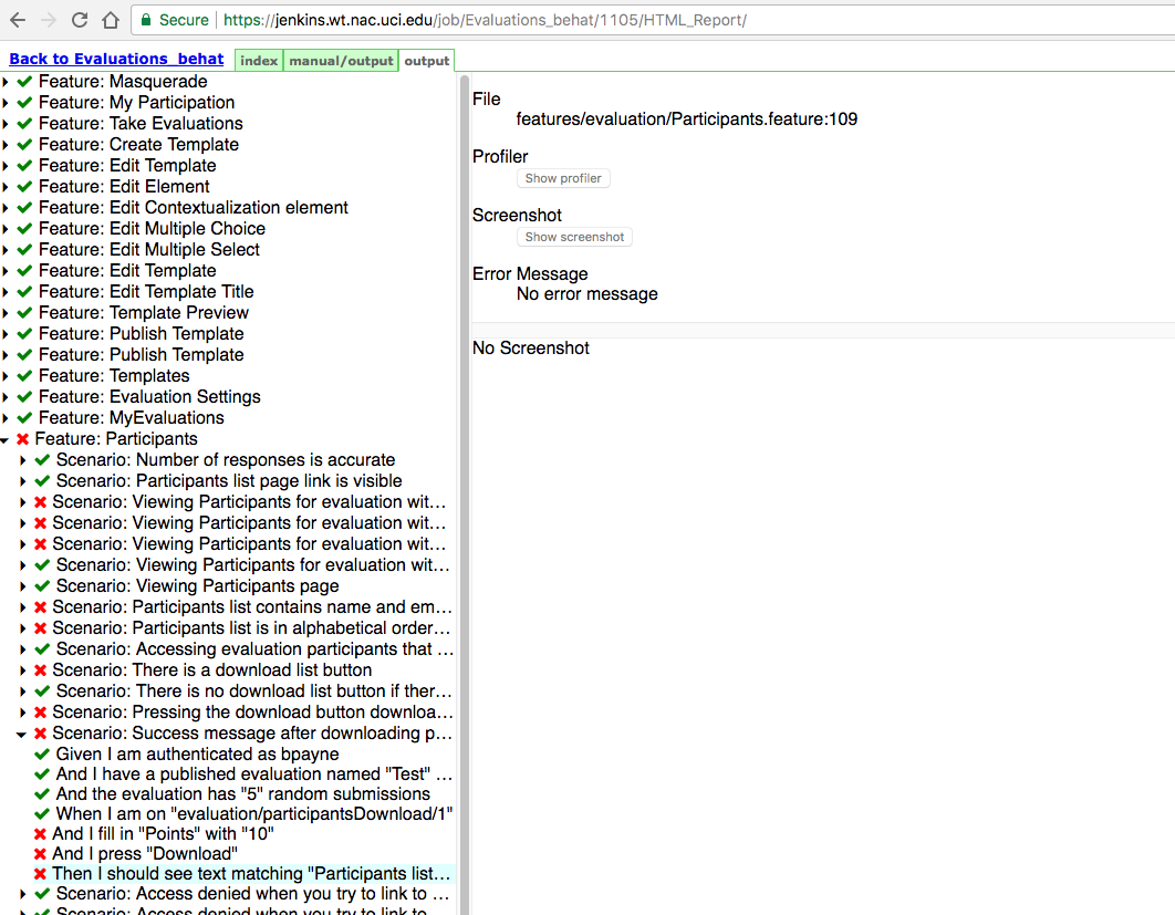 It would be helpful to either be able to expand that left column of the list of steps out so that you could read the whole scenario instead of it ending with an ellipsis "Then I should see text matching 'Participant list ..." or to just have the step written out on the larger portion of the screen once you click on it. Like have a section after 'Error Message: ' that says 'Step: ' with the step written out.