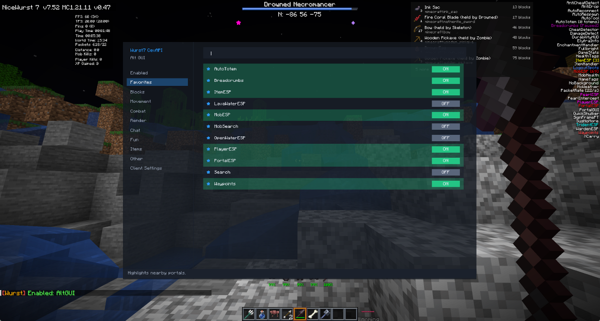 ./gradlew build -Pnicewurst=1This Wurst fork now supports Meteor-style addons through a custom entrypoint using Fabric.
