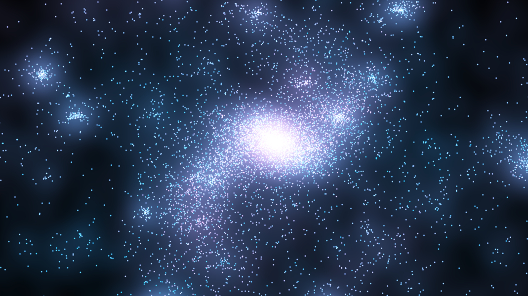 Each particle is rendered as a fixed-size flare, generated from a gaussian. Particle color depends on velocity, blue at low speeds and purple at high speeds. Additive blending is set, so dense regions look bright. The render target is RGBA16F, because GL_R11F_G11F_B10F looks yellow on subsequent render passes.