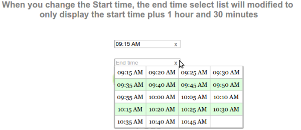 In this case, the user selects a start time and the end time will be modified to only display the start time plus 1 hour and 30 minutes later