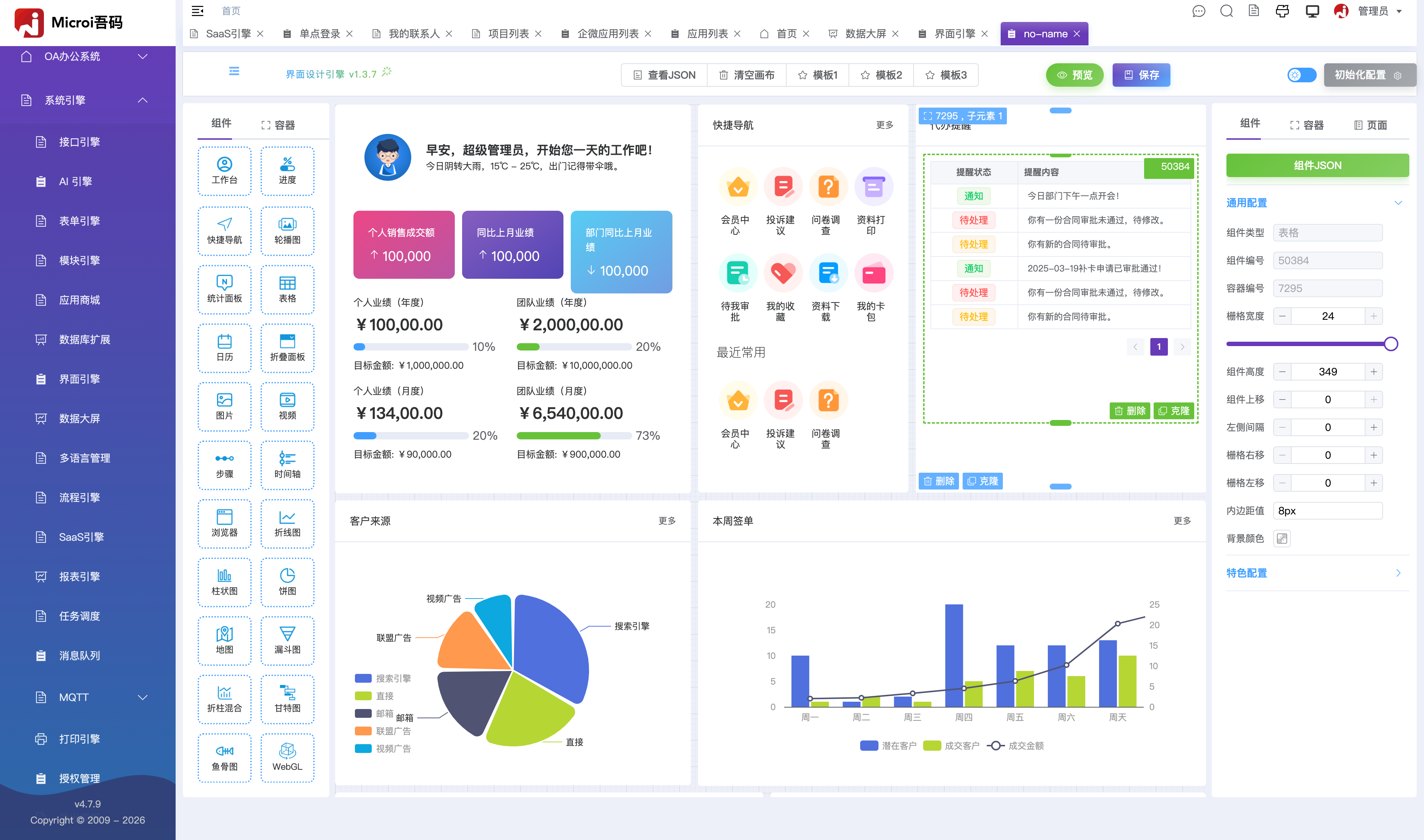 | 📝 表单引擎 | 支持扩展组件、自定义 Vue 组件嵌入表单、V8 引擎事件,灵活实现复杂业务逻辑 |