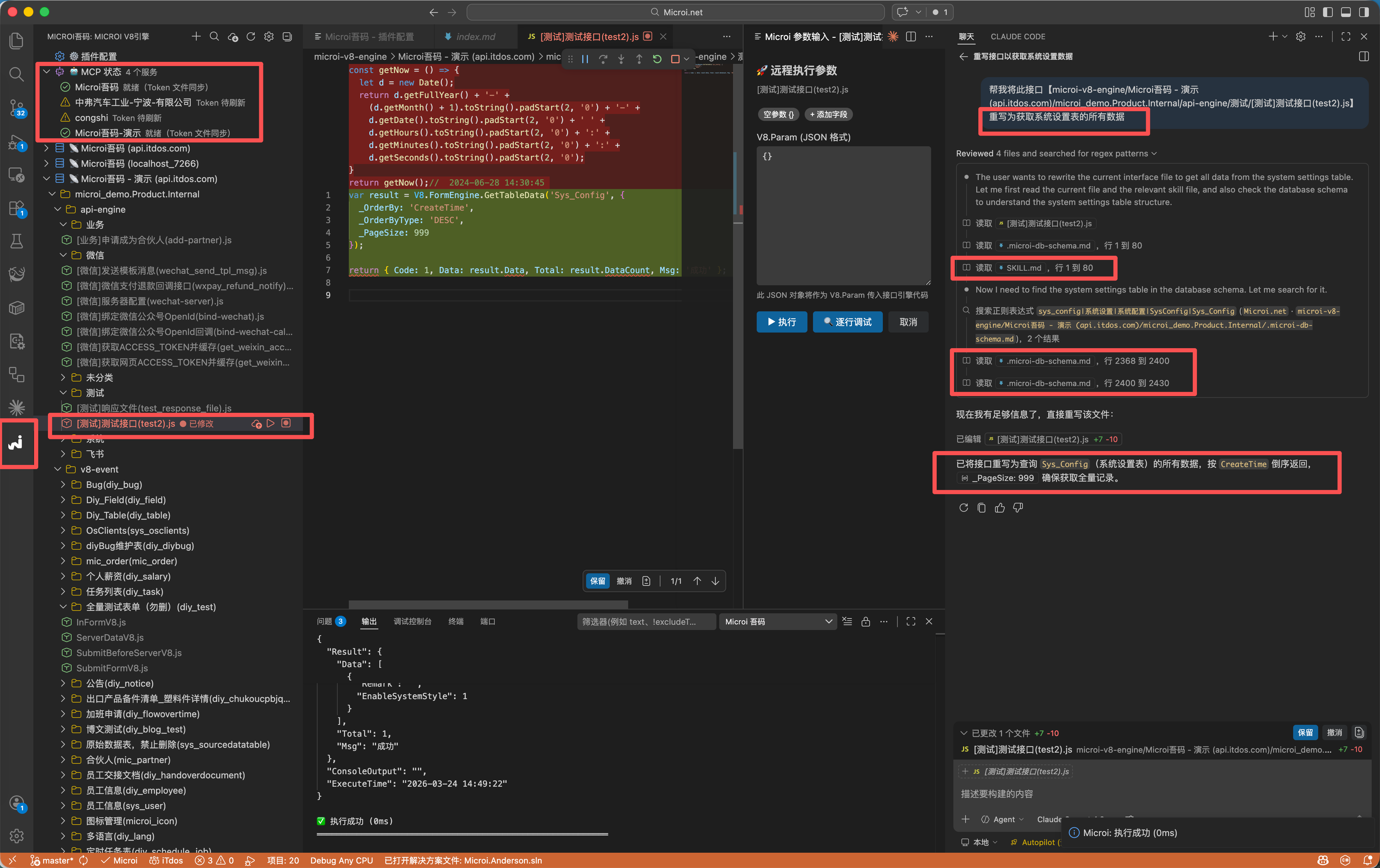 | 在线 AI 编程 | 平台内置 DeepSeek / ChatGPT / Kimi 等 | 上传 V8 文档 + 数据库结构(db.json),AI 直接生成接口引擎代码,支持代码补全、智能检查与优化 |