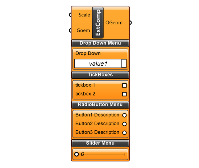 DummyExtendableSwitcher: An example of an extendable component, built using a GH_SwitcherComponent class from the base Karamba components. The component provides a primary usage of scaling a given geometry and and multiple different extendable menus displaying a variety of menu concepts: