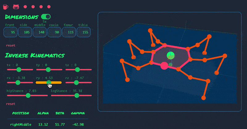 You can use this web app to solve inverse kinematics, simulate various gaits, and more. In real time, you can also view all the angles the robot's eighteen joints make at any particular pose. All the computations are solely done in your browser, nothing's fetching data from somewhere else, so it should be fast. Another (somewhat) cool thing is that this app does NOT depend on any external mathematics library; it only uses Javascript's built-in Math object.