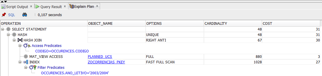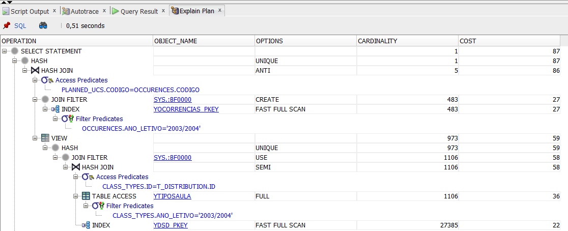 CREATE INDEX IX_ZUCS_CODIGO_CURSO ON ZUCS(codigo, curso);The first one is useful since the tipo column from ZTIPOSAULA is used in the HAVING clause to determine if a course has all types of classes. This makes the HAVING statement have a cost of 13 instead of 37. In spite of this, the total cost of the query won't change with this index.