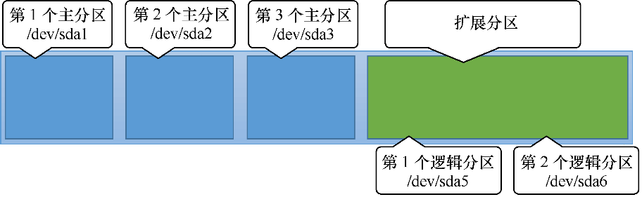 由于现在的 IDE 设备已经很少见了,所以一般的硬盘设备都会是以“/dev/sd”开头的。而一台主机上可以有多块硬盘,因此系统采用 a~p 来代表 16 块不同的硬盘(默认从 a 开始分配),而且硬盘的分区编号也很有讲究: