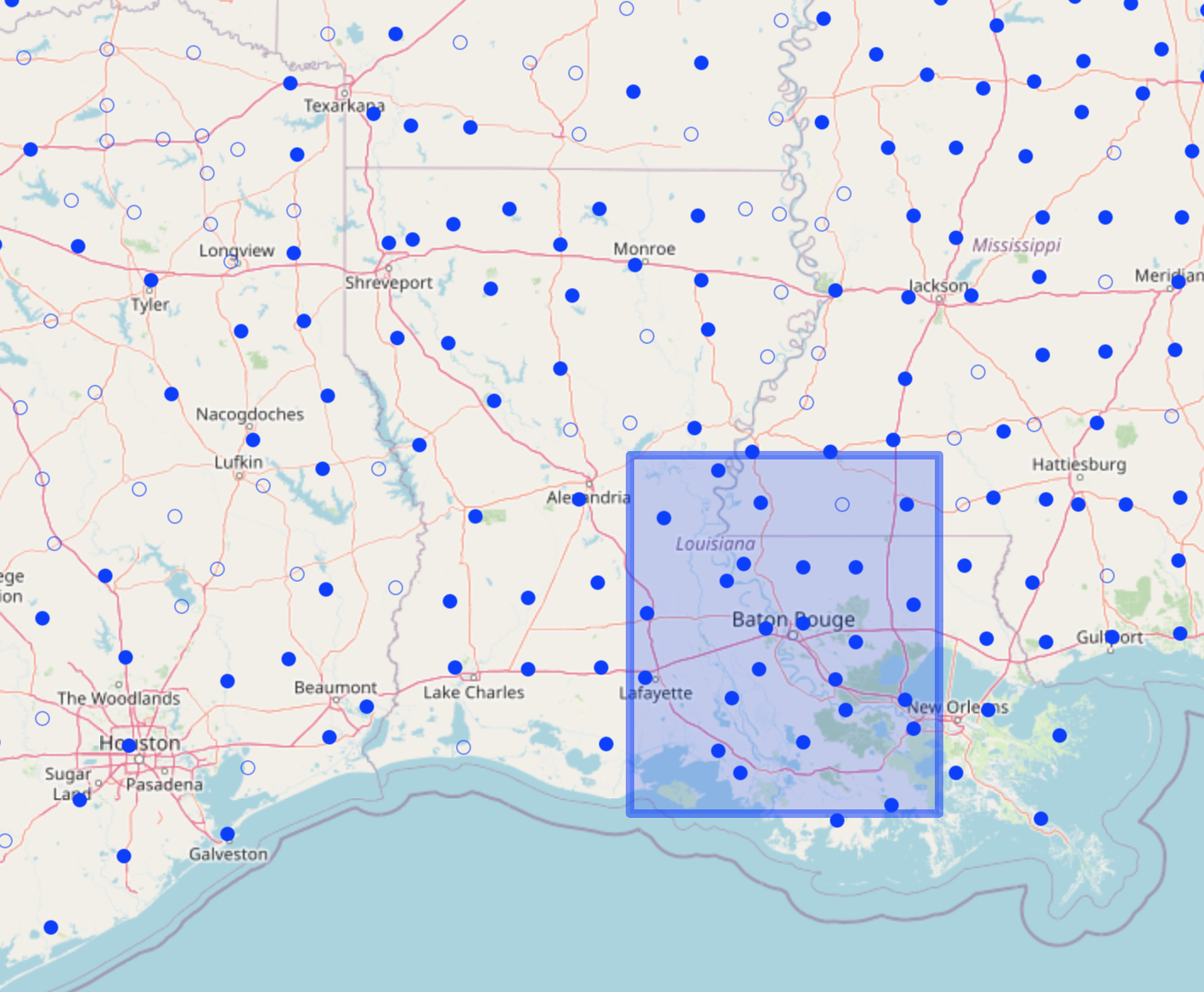 So far we have a buffer set up with a 3 degrees in longitute and latitude, then the distance in miles is estimated assuming Earth is a sphere. (approx. 300x300 mile square)