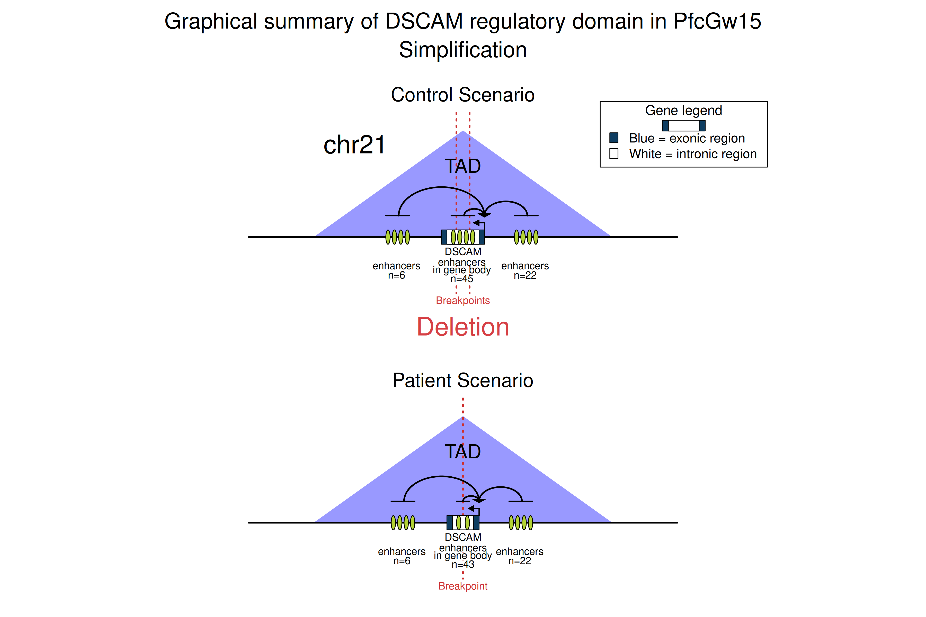 One illustrative example involves the DSCAM gene. In an autism patient, an intronic deletion identified within DSCAM was found to downregulate this gene through the deletion of several enhancers (link to manuscript). To check the POSTRE prediction for this deletion, enter the following coordinates (hg19): chr21 42016189 42030325, and select the Neurodevelopmental phenotype category. A simplified graphical abstract generated by POSTRE for this case can also be viewed here.