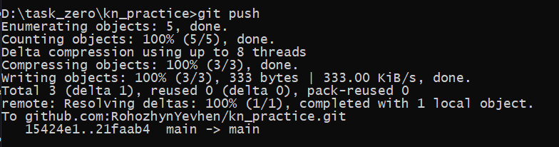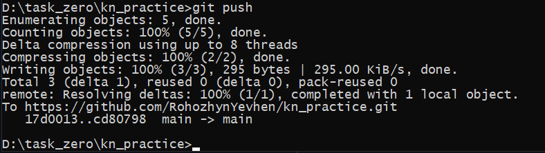 Сриншот выполнения команды git push (теперь она проходит без входа в аккаунт)